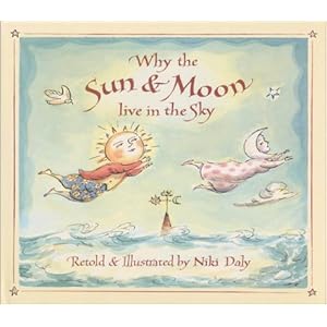 Why the Sun & Moon Live in the Sky, retold and illustrated by Niki Daly, is a lovely Nigerian folktale about how Sun’s infatuation with Sea led to him and Moon retreating to the sky forever.